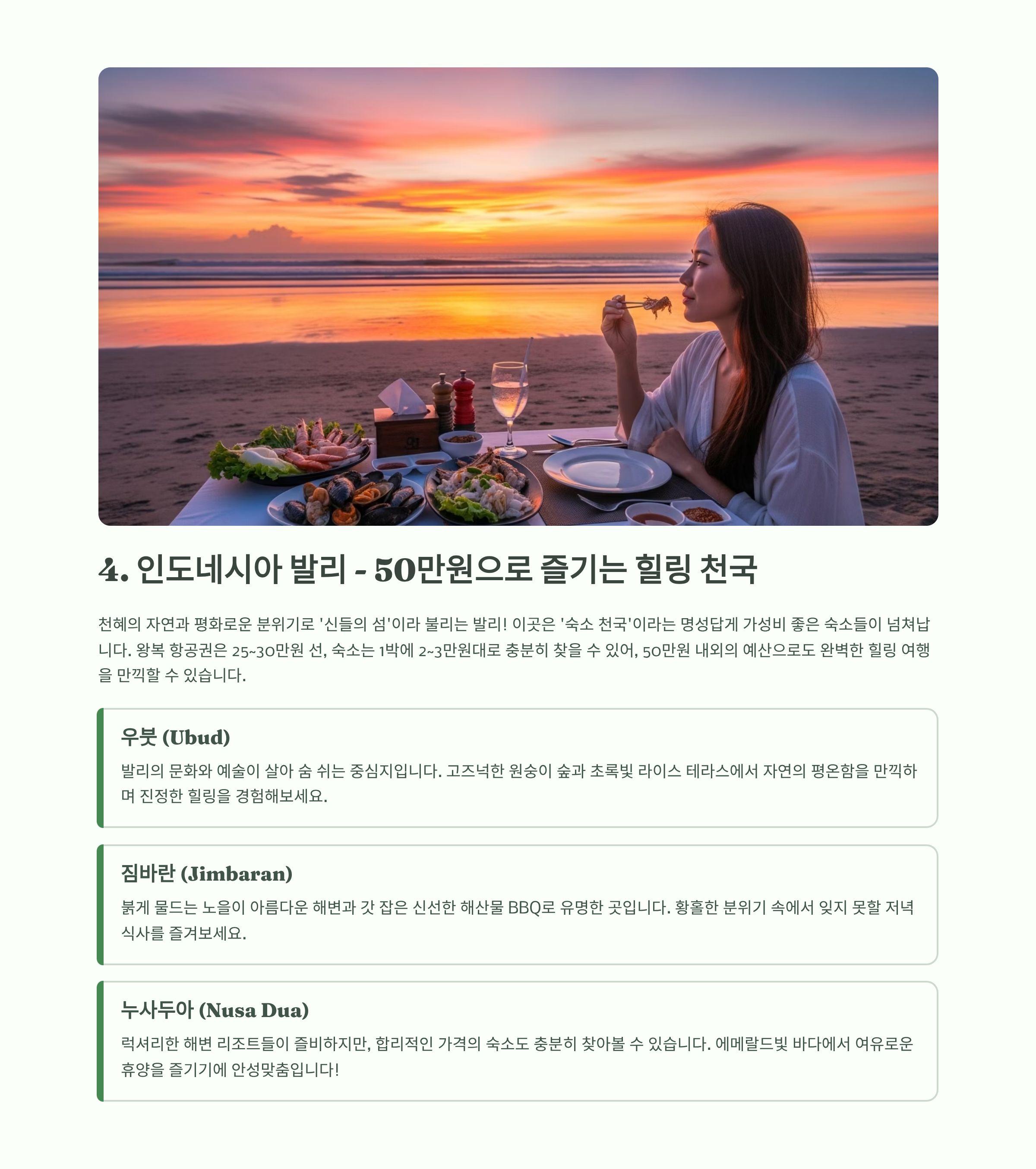 우붓, 짐바란, 누사두아 같은 지역을 조합하면 50만 원 내외로도 힐링 여행 충분히 가능합니다.