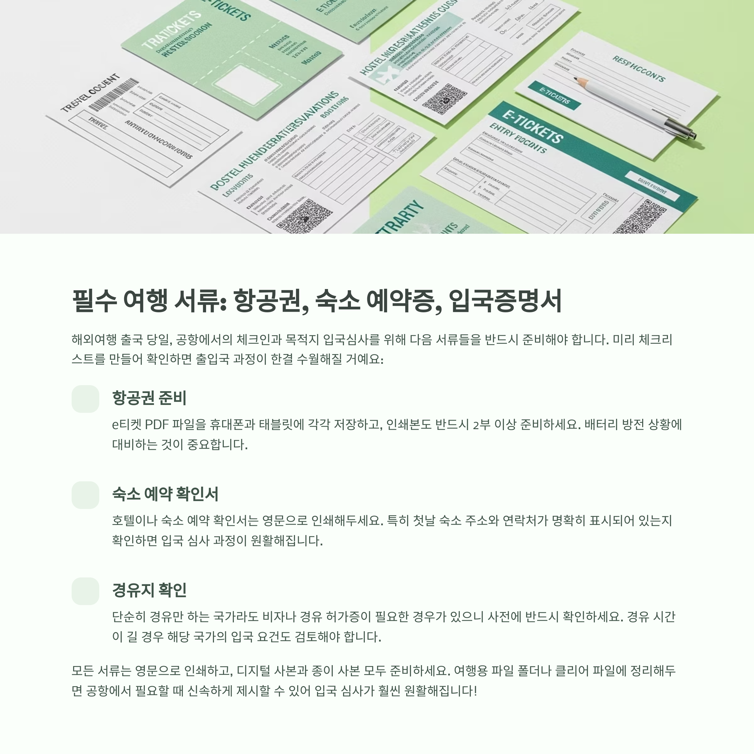 - 항공권: e티켓 PDF 파일 저장 + 인쇄본 준비
