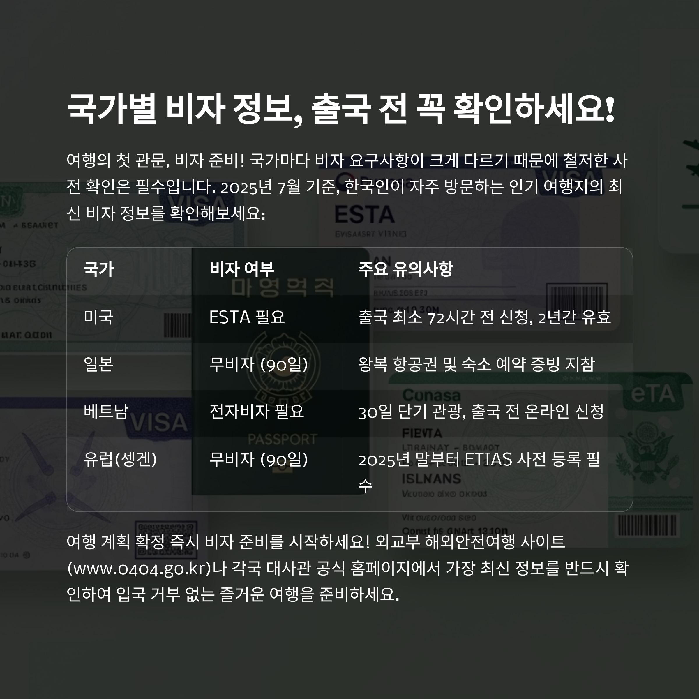 2025년 7월 현재 기준, 주요 인기 여행지 비자 정보는 아래와 같아요: