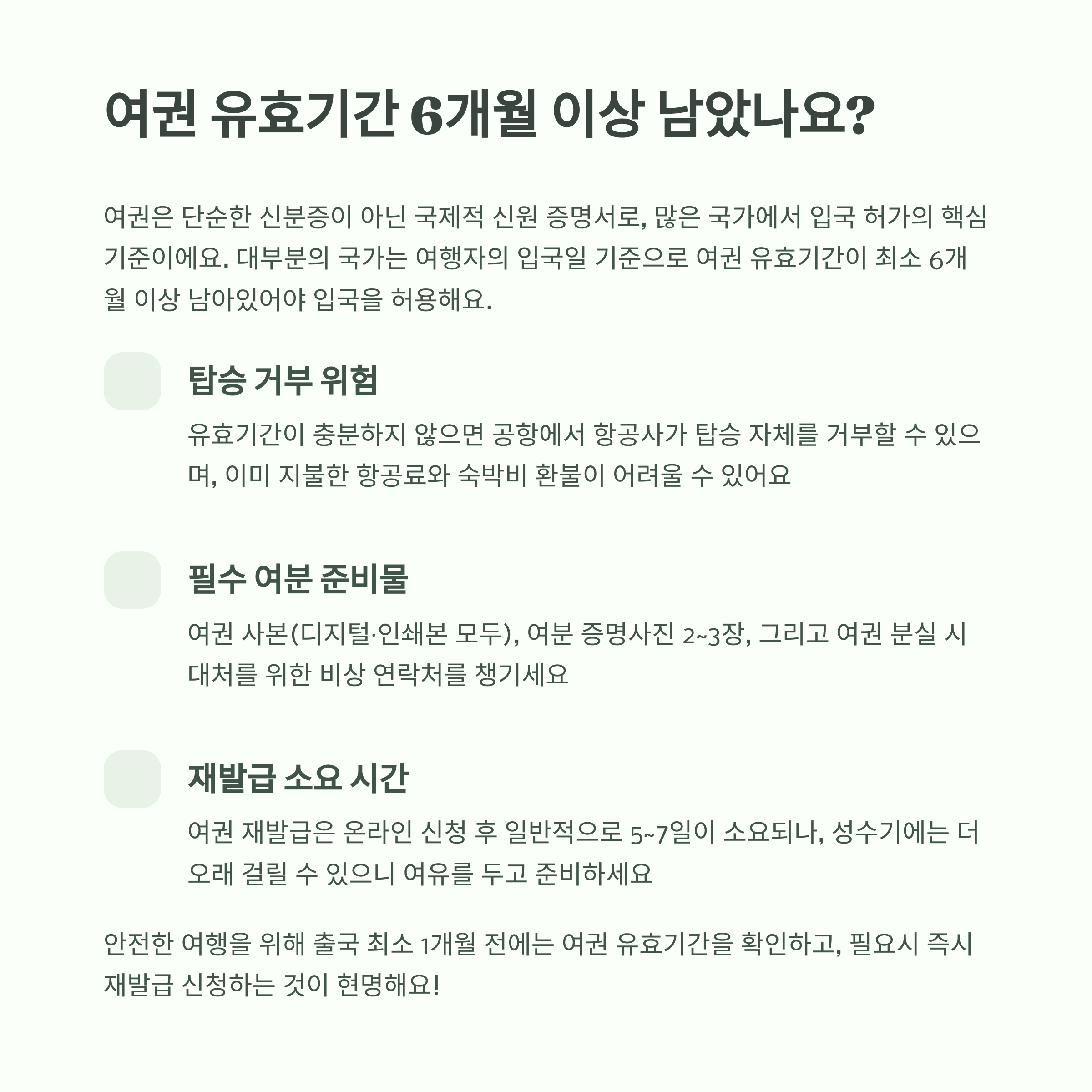 - 여권 유효기간 6개월 이상 남았는지 확인