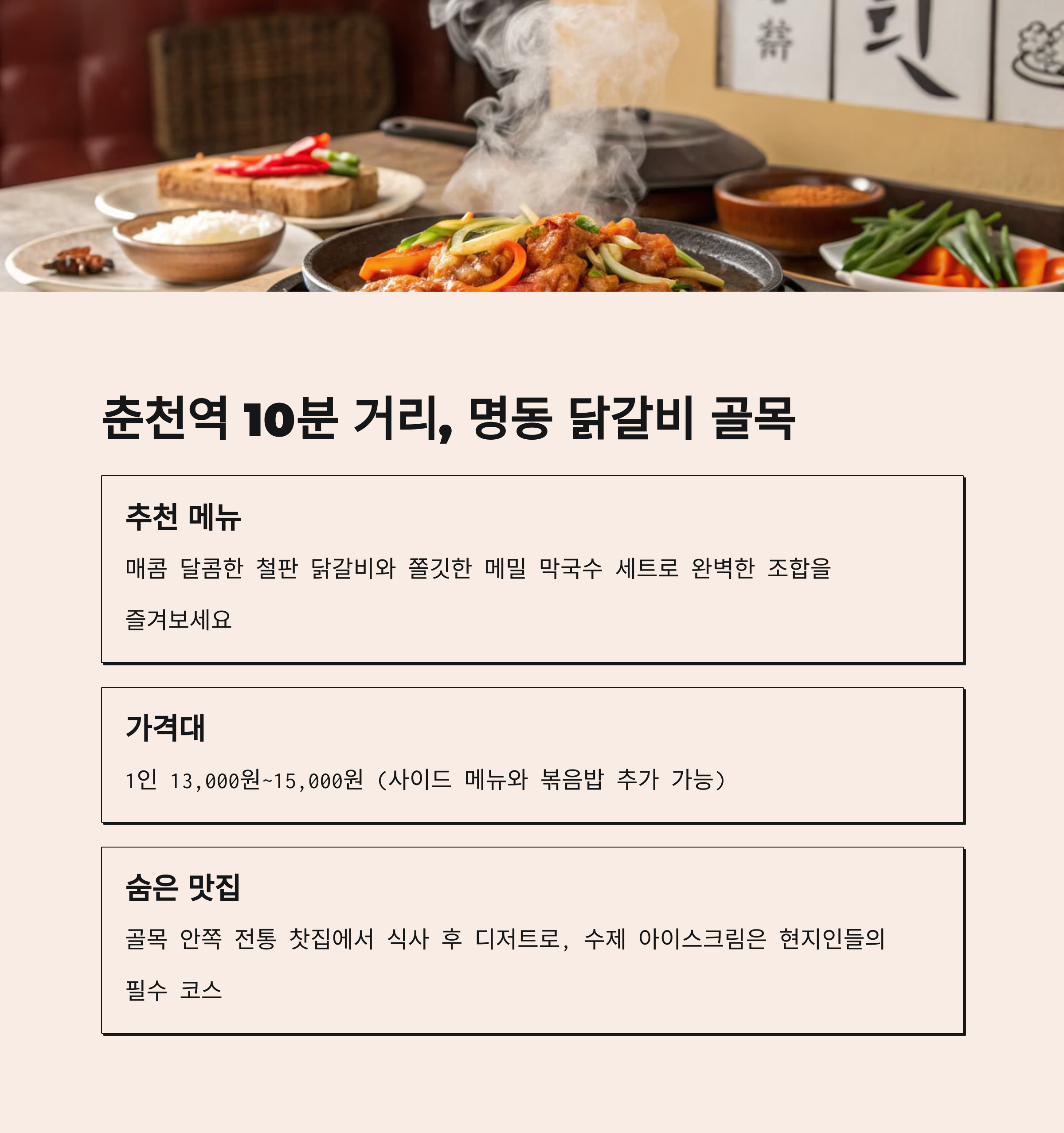 "닭갈비 골목 근처엔 전통 찻집과 수제 아이스크림 가게도 숨어 있으니 놓치지 마세요!"
