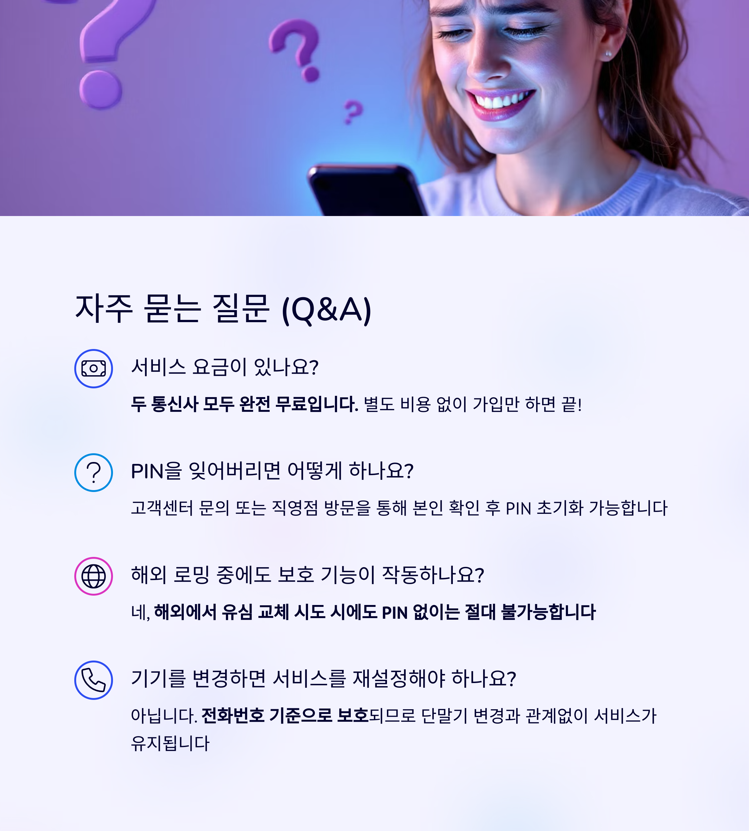 | 효과 | 해킹·도용자 접근 차단 / 금융·통신 인증 안전 / 로밍 중 유심 탈취 예방 가능 |