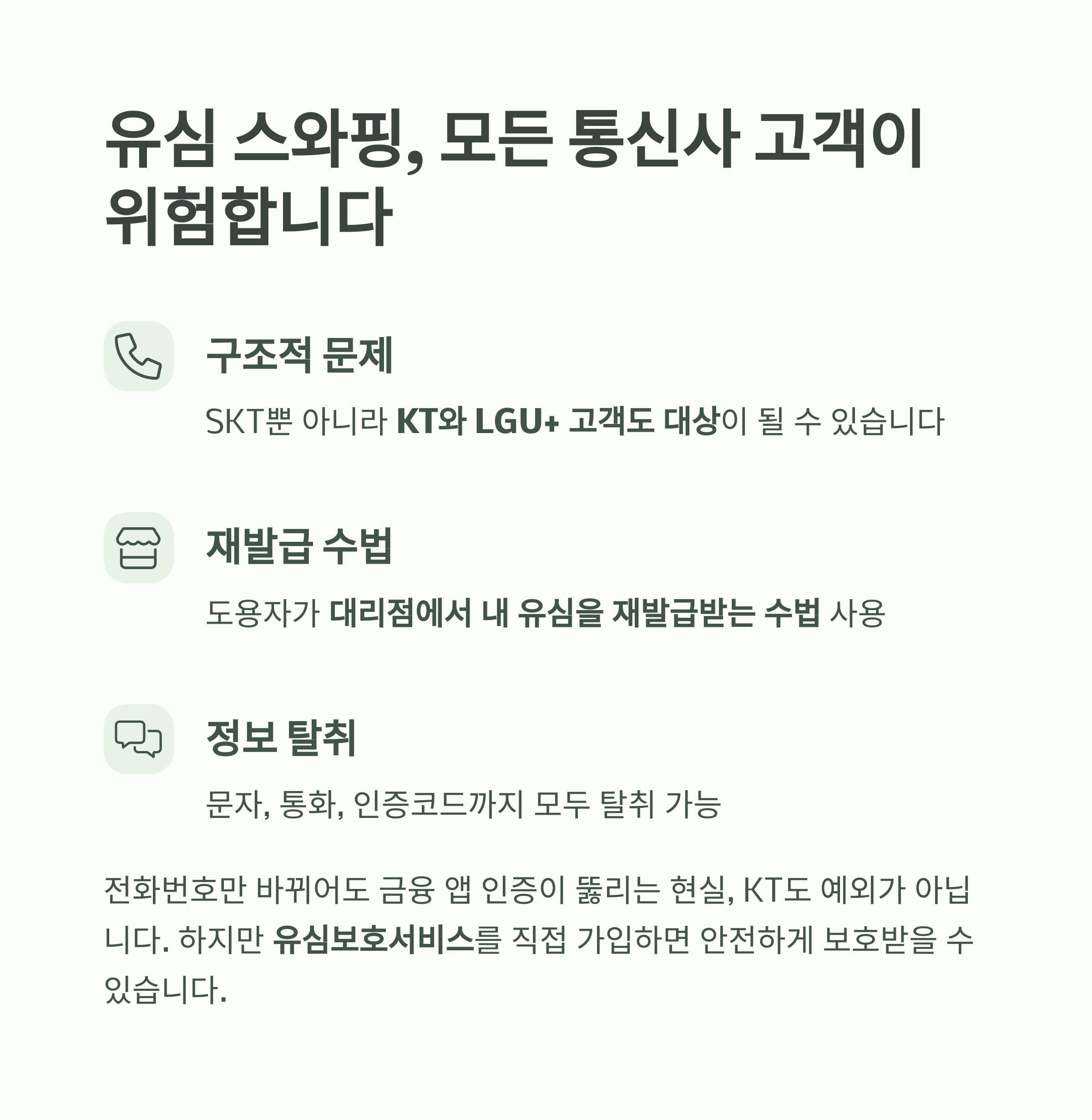 KT 역시 "유심보호서비스"라는 명확한 방어 시스템을 제공하고 있습니다.