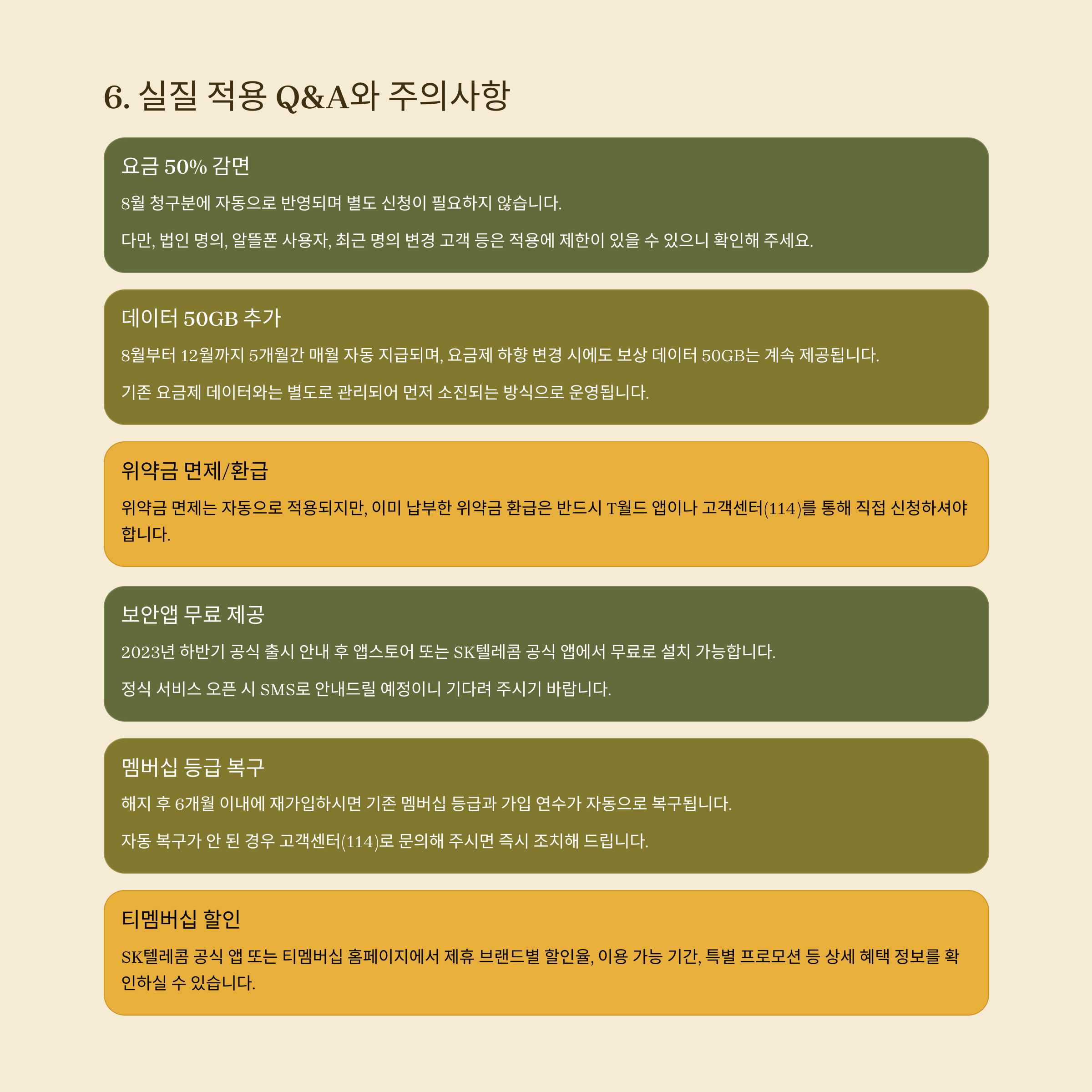 | 요금 50% 감면 | 별도 신청 필요 없이 8월 청구분 자동 반영(명의 변경, 법인·알뜰폰 제외 등 일부 제한) |