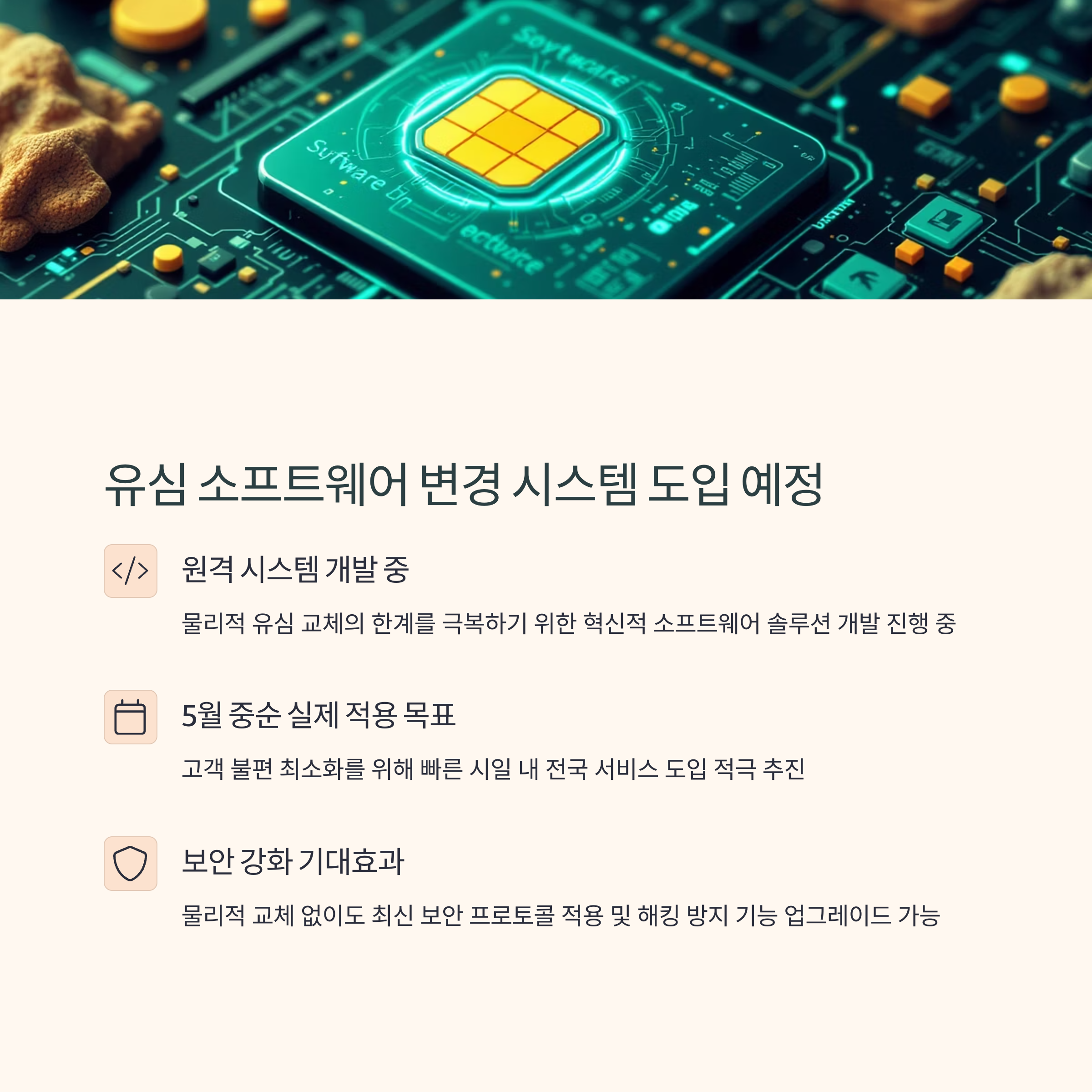 SK텔레콤은 유심 물리적 교체의 한계를 극복하기 위해 유심 소프트웨어 변경 시스템을 개발 중이며, 5월 중순 적용을 목표로 하고 있습니다. 이를 통해 기존 유심을 물리적으로 교체하지 않고도 보안 강화를 도모할 수 있을 것으로 기대됩니다. (유심 부족에 교체율 고작 1%…SK텔레콤이 고민 끝 내놓은 대책 - Daum)